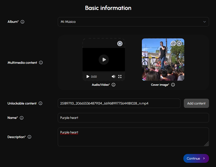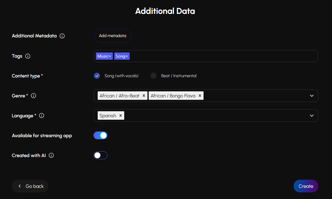 In this case, we have chosen the music category. The process of creating the release in all categories is very similar. Mainly, what varies is certain information (metadata) that the creator can add to the release. In this regard, we recommend you see the article How to upload the ISRC code, song lyrics and other specific data to your releases?